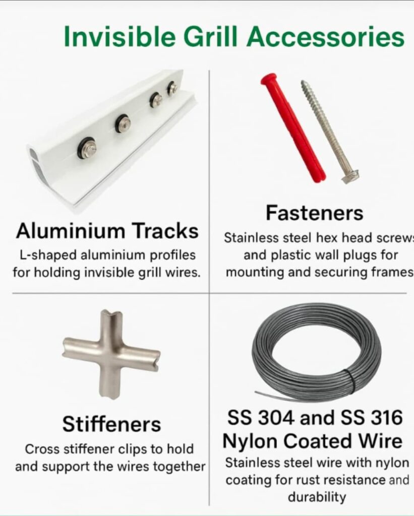 GSA Enterprises’ SS invisible grills use high-tensile stainless-steel cables (often grade 316) to deliver secure, corrosion-resistant protection. Their slim design ensures minimal visual impact, safeguarding children and pets on balconies or windows. Easy to maintain, these grills are strong, durable, and elegantly discreet.